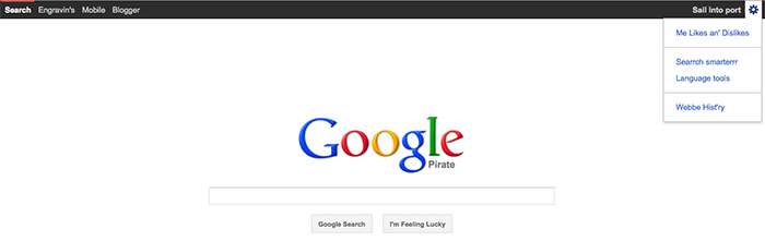 There are a couple of ways to access it. The easiest is to type “google pirate” into the search bar, and hit “I’m Feeling Lucky.” But you can also go straight there with this link. While some of the key buttons remain the same, some pretty funny pirate-ized mutations pop up in the altered version. The Home page, for your consideration: